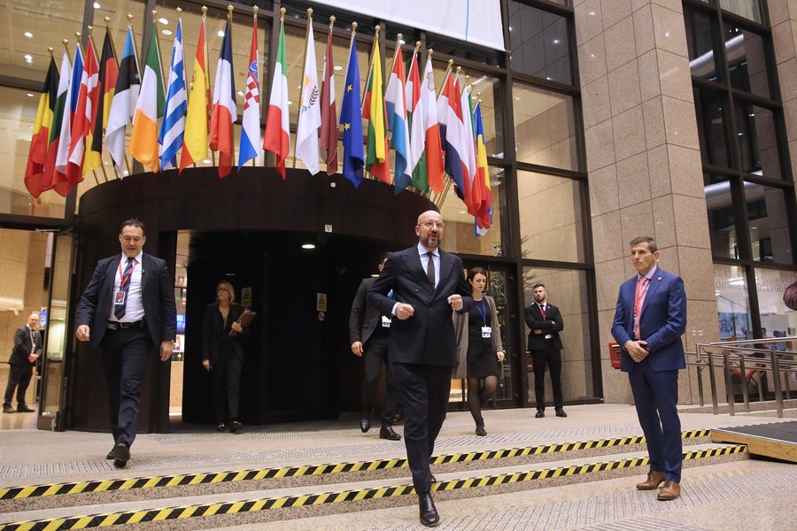 European Council President Charles Michel (C) prepares to talk with the media after the first day's meeting of European Union (EU) leaders in Brussels, Belgium, Dec. 15, 2023. (Xinhua/Zhao Dingzhe)