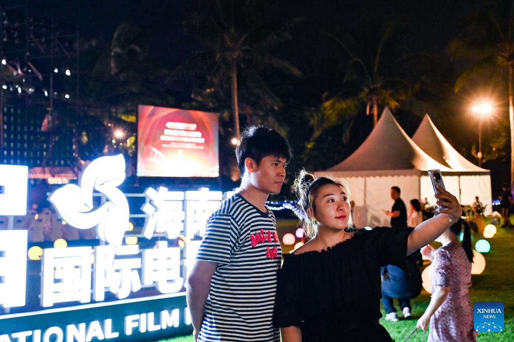 People take a selfie during the opening ceremony of the 5th Hainan Island International Film Festival in Sanya, south China's Hainan Province, Dec. 16, 2023. The festival runs from Dec. 16 to 22. (Xinhua/Fan Yuqing)
