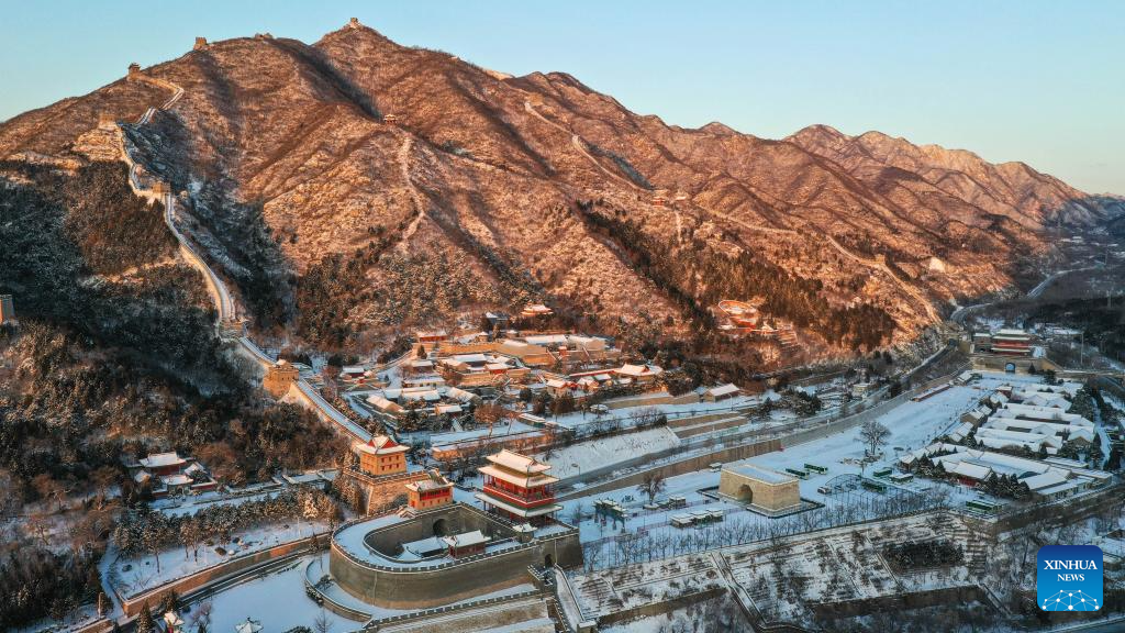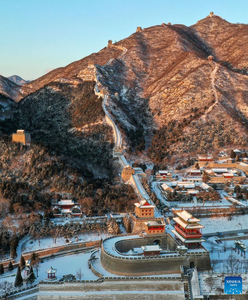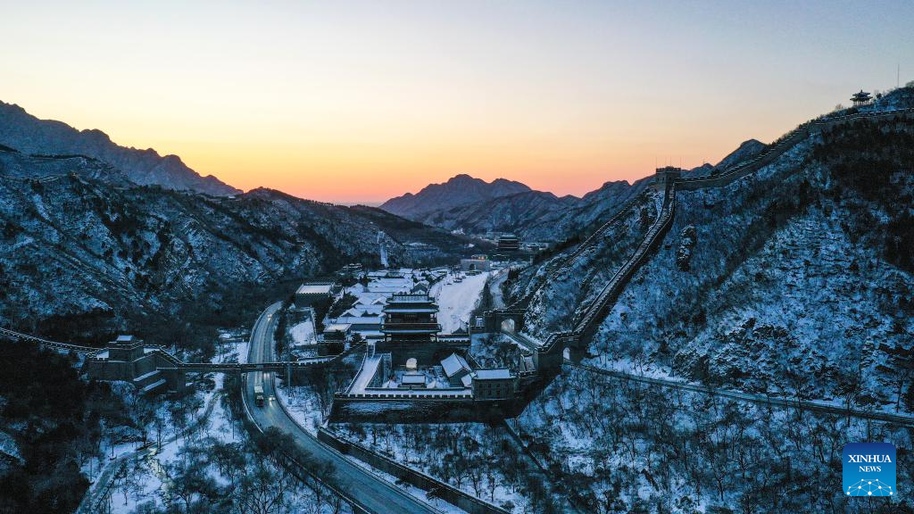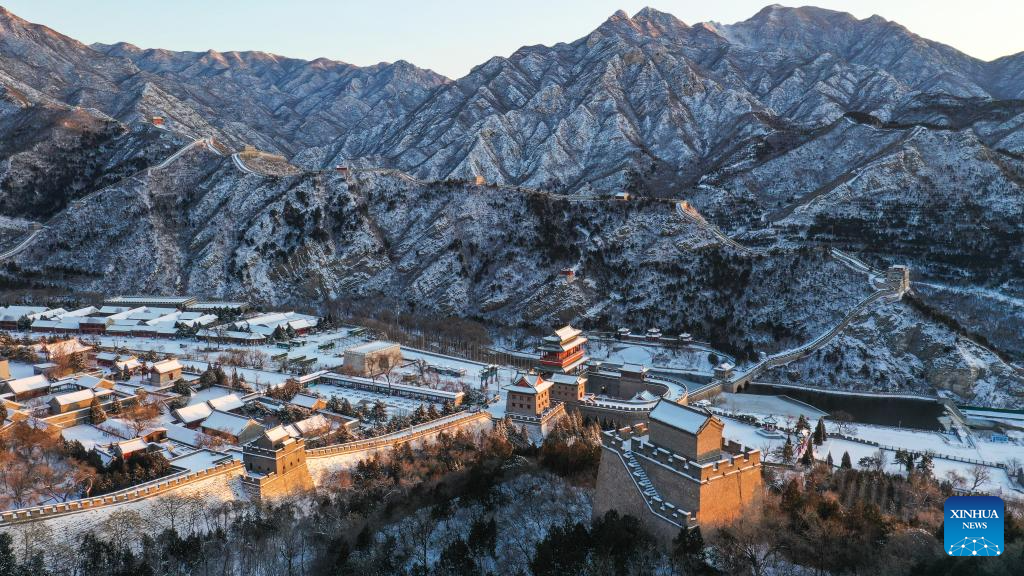 This aerial photo taken on Dec. 16, 2023 shows the snow scenery at the Juyongguan section of the Great Wall at sunrise in Beijing, capital of China. (Xinhua/Chen Yehua)