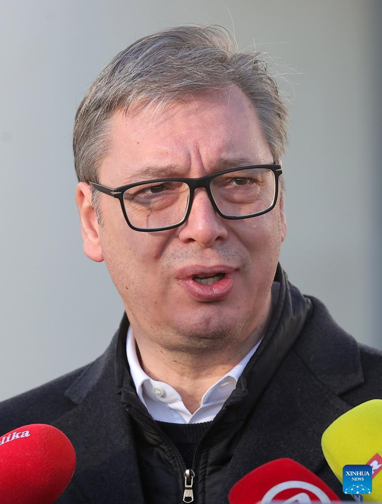 Serbian President Aleksandar Vucic speaks to the media after casting his ballot at a polling station in Belgrade, Serbia, on Dec. 17, 2023. (Photo by Predrag Milosavljevic/Xinhua)