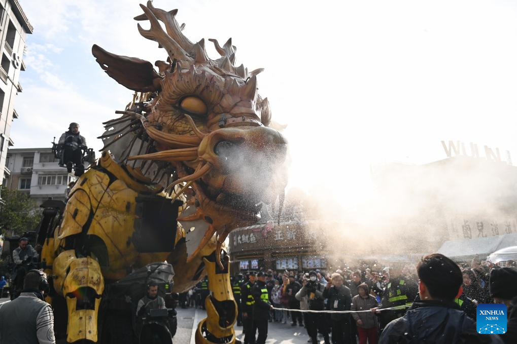People watch as a mechanical device Horse Dragon Long Ma parades on a street in Gongshu District of Hangzhou, east China's Zhejiang Province, Dec. 16, 2023. The device is made in 2014 by French production company La Machine to celebrate the 50th anniversary of diplomatic relations between France and China. (Xinhua/Huang Zongzhi)