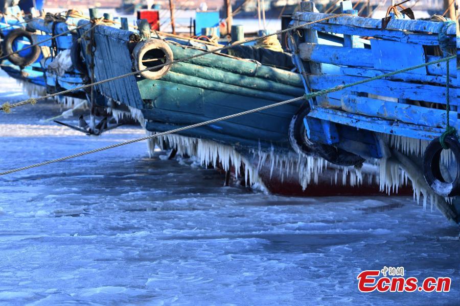 Fishing boats with icicles berth at the frozen Jiaozhou Bay, forming an "ice age" scene in Qingdao, east China's Shandong Province, Dec. 17, 2023. (Photo: China News Service/Wang Haibin)