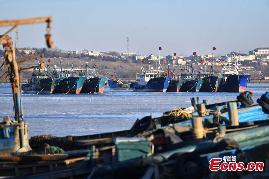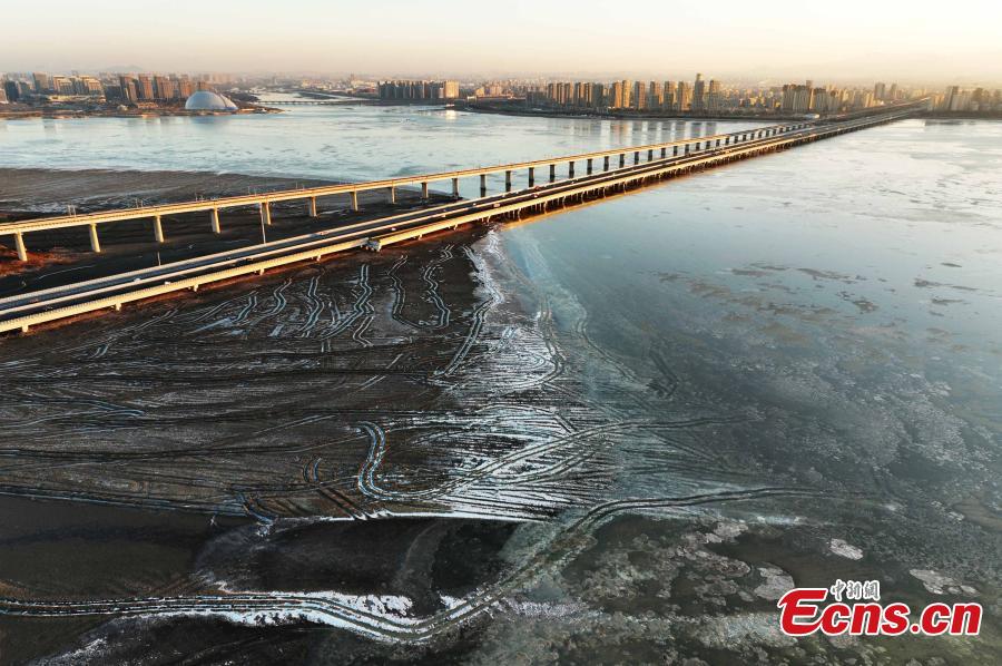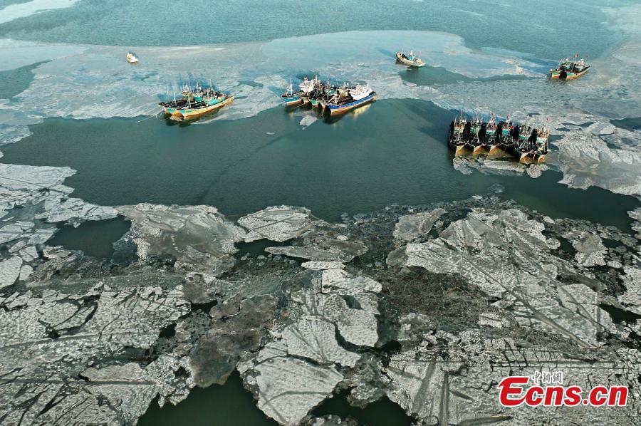 Due to the recent drop in temperatures, layers of sea ice formed in the waters of Jiaozhou Bay.