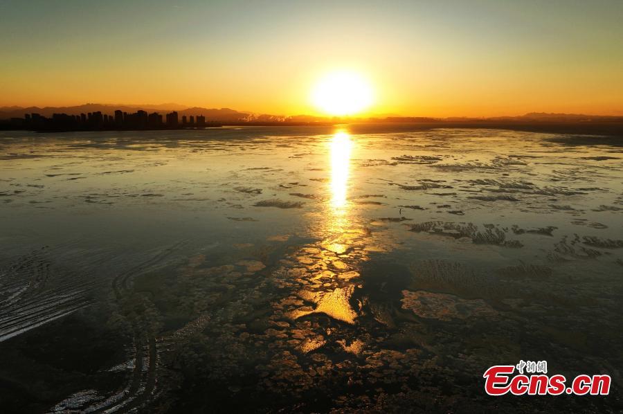 Sunrise scenery at the frozen Jiaozhou Bay in Qingdao, east China's Shandong Province, Dec. 17, 2023. (Photo: China News Service/Wang Haibin)