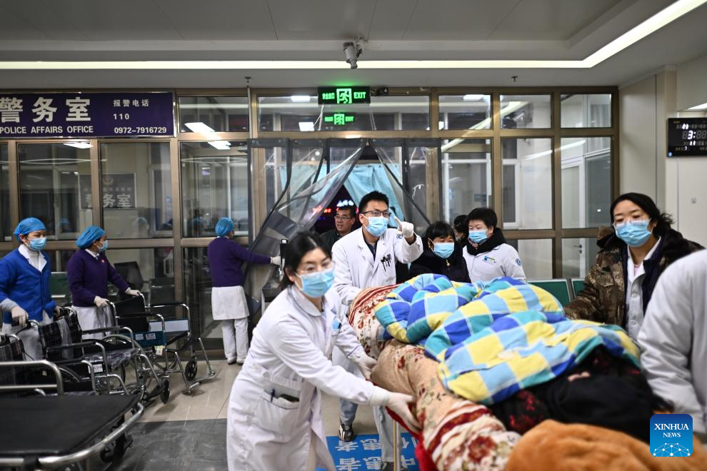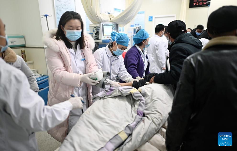A person injured in an earthquake receives treatment at a hospital in Minhe Hui and Tu Autonomous County of Haidong City, northwest China's Qinghai Province, Dec. 19, 2023. (Xinhua/Zhang Hongxiang)