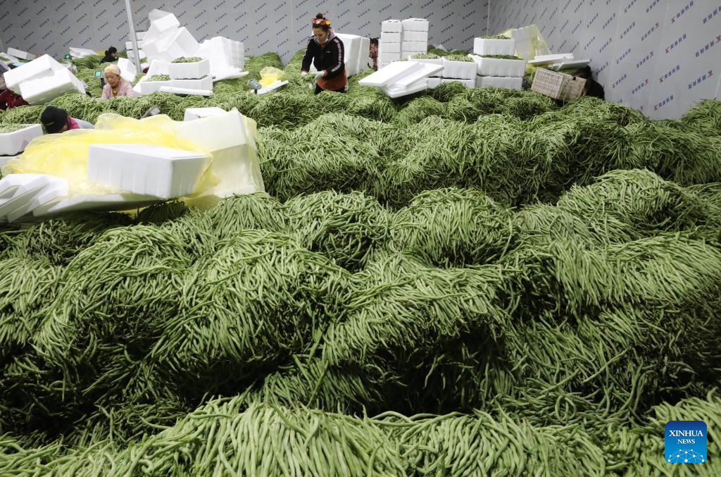 Workers pack green beans at the cold storage of an agriculture enterprise in Menghan Town of Jinghong, southwest China's Yunnan Province, Dec. 17, 2023. Farmers and planting enterprises in Yunnan Province are busy harvesting vegetables to supply the market. Yunnan is an important base for growing and transporting vegetables in winter. (Photo by Li Yunsheng/Xinhua)