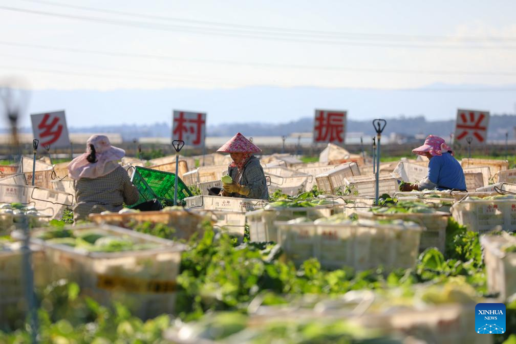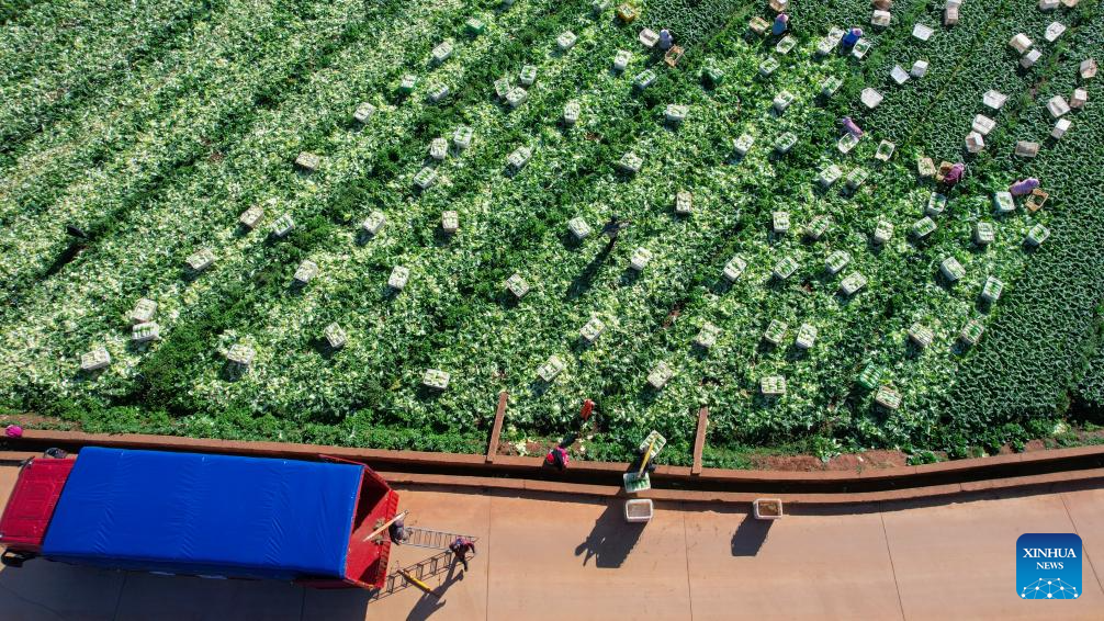 Villagers harvest vegetables at a vegetable planting base in Luliang County of Qujing City, southwest China's Yunnan Province, Dec. 18, 2023. Farmers and planting enterprises in Yunnan Province are busy harvesting vegetables to supply the market. Yunnan is an important base for growing and transporting vegetables in winter. (Photo by Wang Yong/Xinhua)