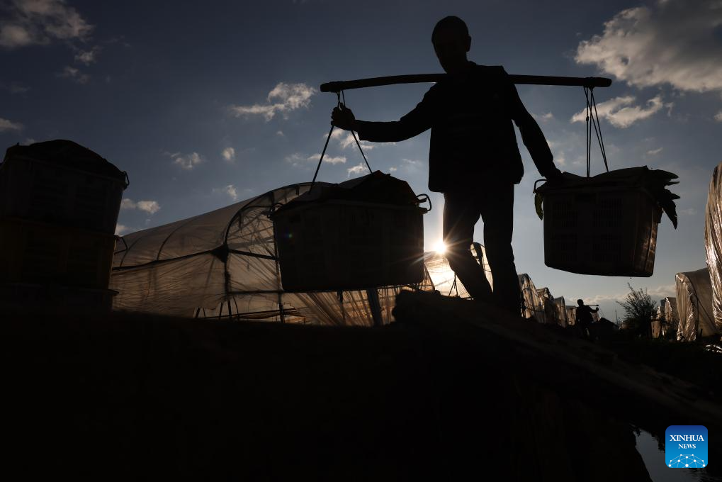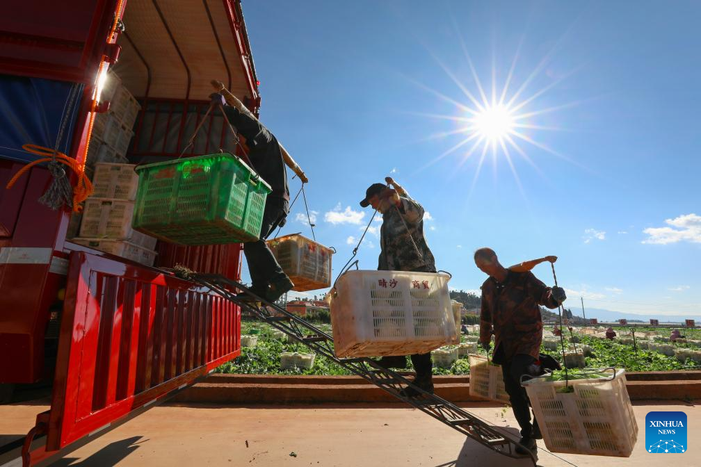 A villager transports vegetables in Kele Village of Kunming, southwest China's Yunnan Province, Dec. 17, 2023. Farmers and planting enterprises in Yunnan Province are busy harvesting vegetables to supply the market. Yunnan is an important base for growing and transporting vegetables in winter. (Photo by Zhang Zhengju/Xinhua)