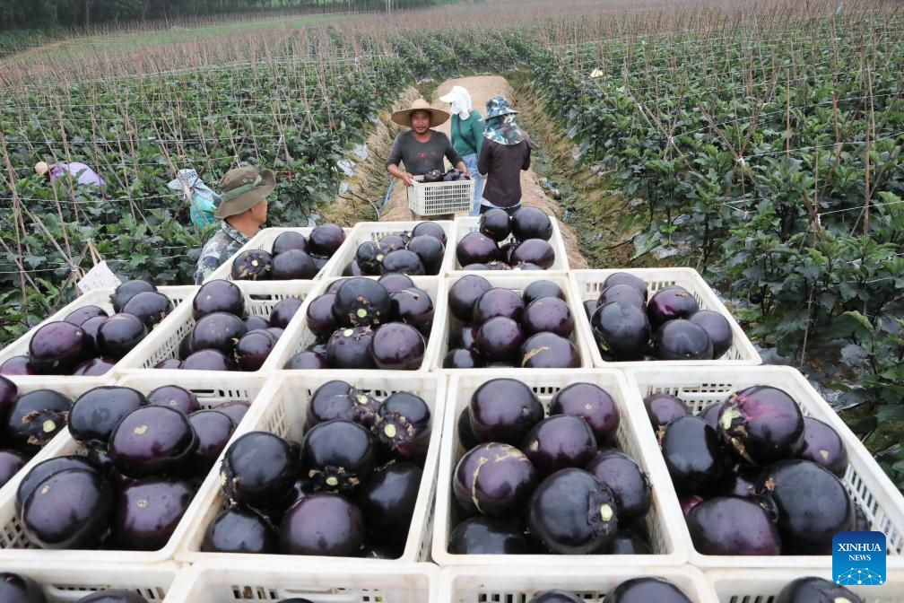 Villagers pick eggplants at a planting base in Menghan Town of Jinghong, southwest China's Yunnan Province, Dec. 17, 2023. Farmers and planting enterprises in Yunnan Province are busy harvesting vegetables to supply the market. Yunnan is an important base for growing and transporting vegetables in winter. (Photo by Li Yunsheng/Xinhua)