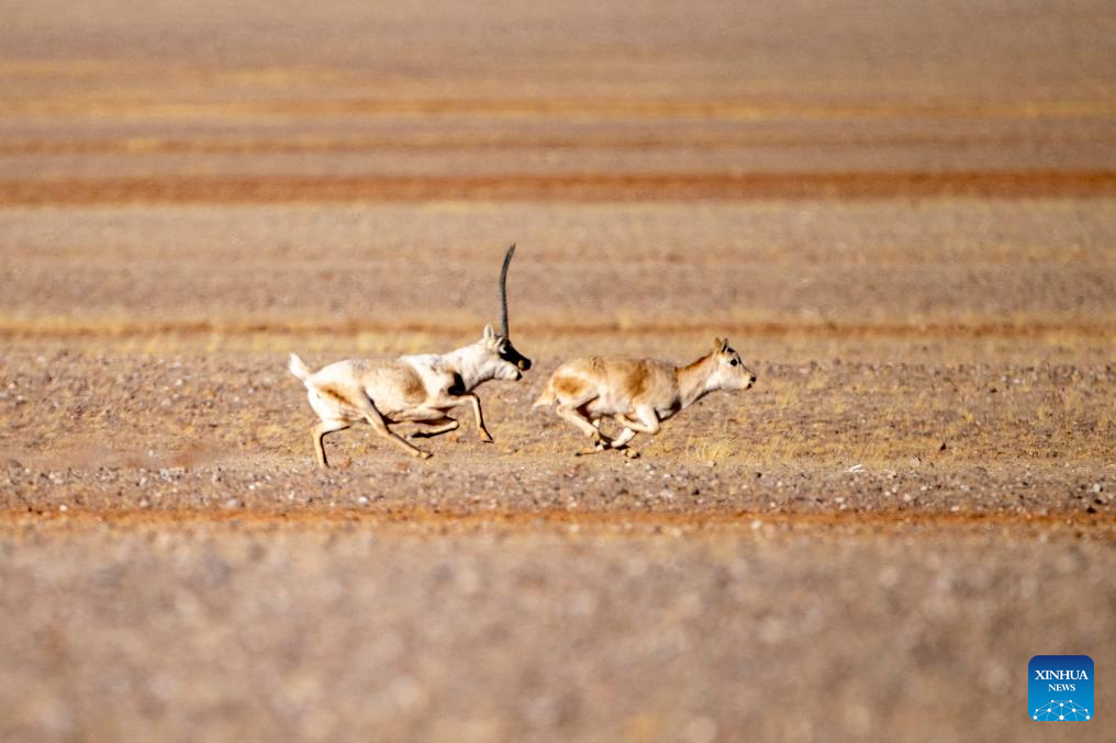 A male Tibetan antelope (L) pursues a female one for mating at the Qiangtang National Nature Reserve in the northern part of southwest China's Xizang Autonomous Region, Dec. 17, 2023. (Xinhua/Liu Wenbo)