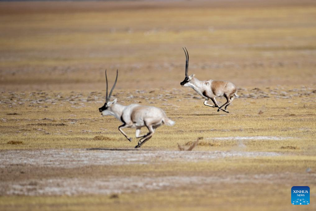 A male Tibetan antelope (1st L) pursues a female one for mating at the Qiangtang National Nature Reserve in the northern part of southwest China's Xizang Autonomous Region, Dec. 17, 2023. (Xinhua/Jiang Fan)