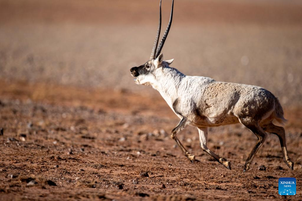 A male Tibetan antelope gallops at the Qiangtang National Nature Reserve in the northern part of southwest China's Xizang Autonomous Region, Dec. 16, 2023. (Xinhua/Jiang Fan)