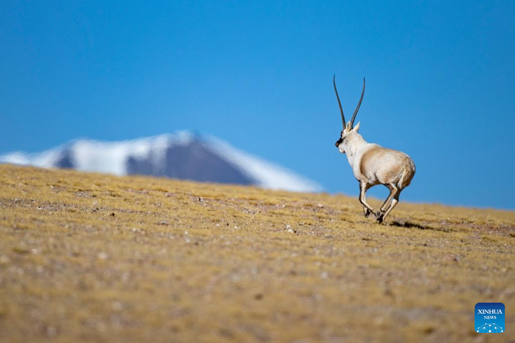 A male Tibetan antelope gallops at the Qiangtang National Nature Reserve in the northern part of southwest China's Xizang Autonomous Region, Dec. 16, 2023. (Photo by Tenzin Norbu/Xinhua)
