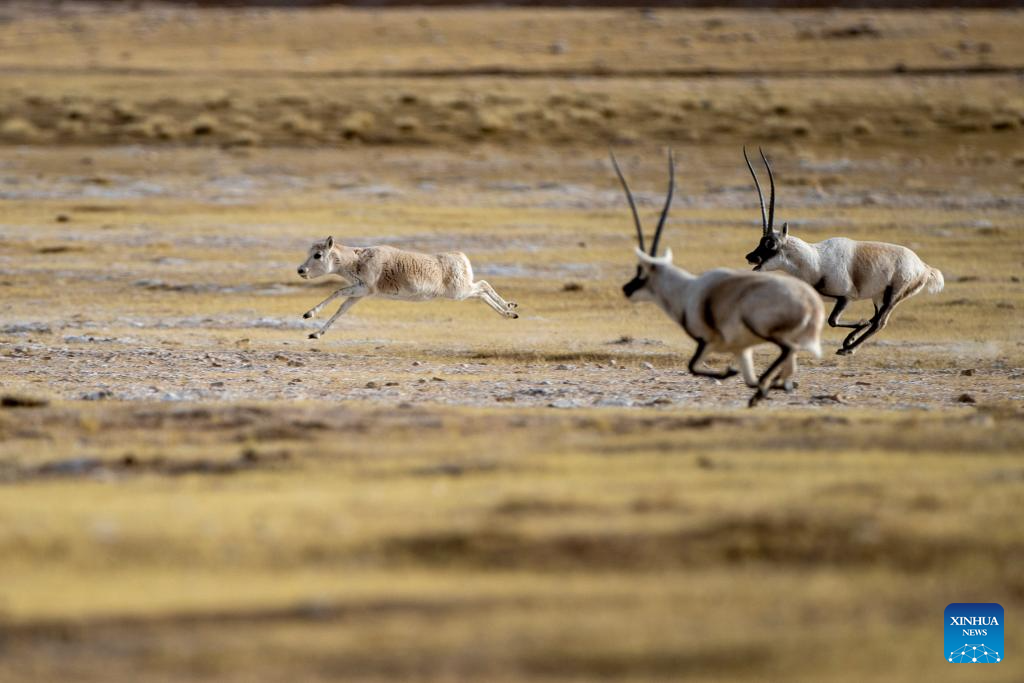 Two male Tibetan antelopes pursue a female one for mating at the Qiangtang National Nature Reserve in the northern part of southwest China's Xizang Autonomous Region, Dec. 16, 2023. (Xinhua/Jiang Fan)