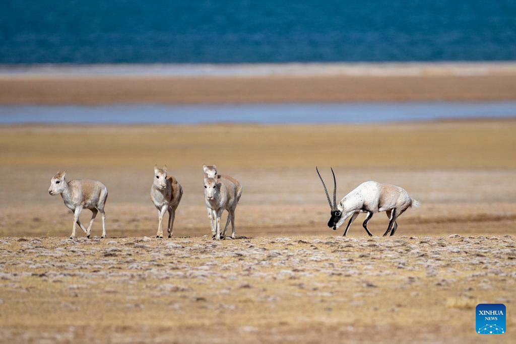 A male Tibetan antelope (1st R) guards its female partners after winning the mating right at the Qiangtang National Nature Reserve in the northern part of southwest China's Xizang Autonomous Region, Dec. 16, 2023. (Xinhua/Jiang Fan)