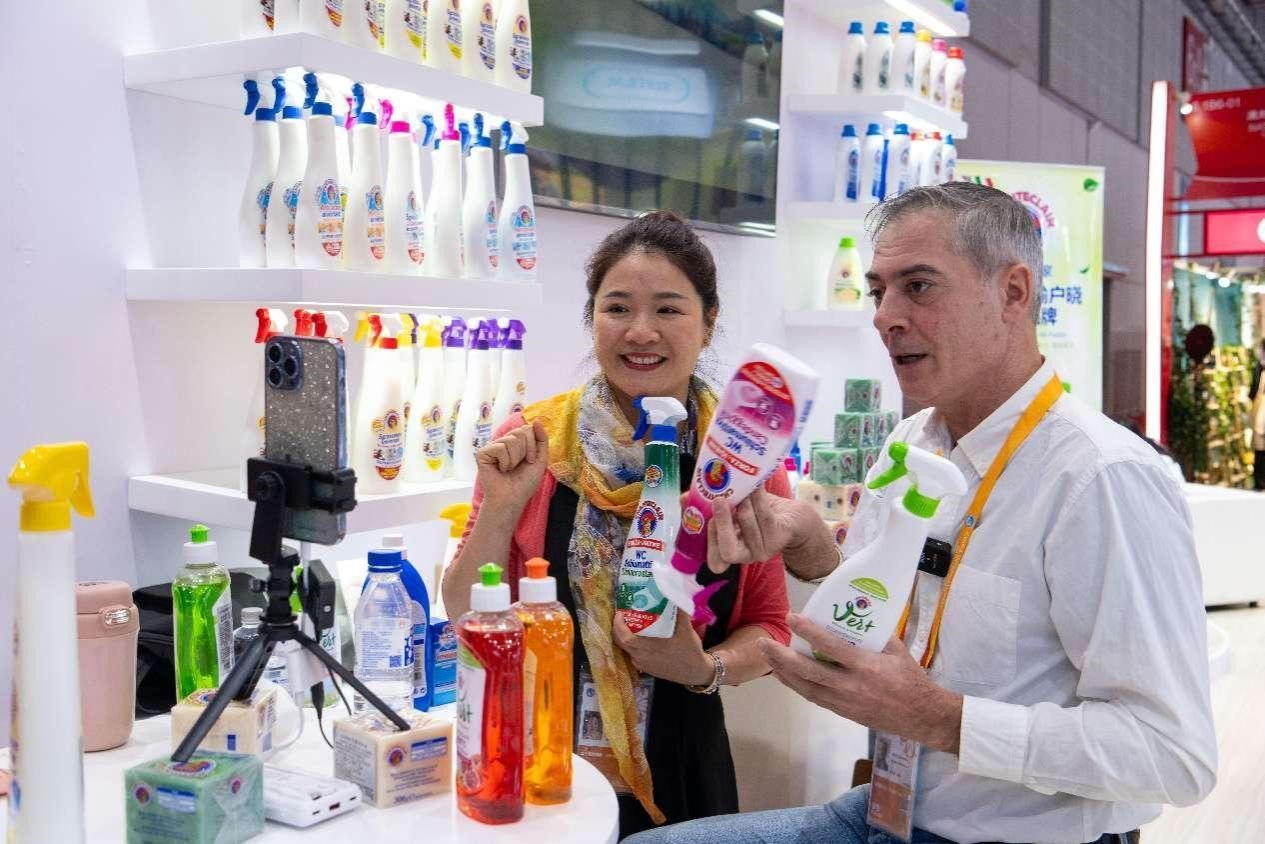 An exhibitor sells kitchen cleaning products from Italy via livestreaming at the sixth China International Import Expo in Shanghai, Nov. 7. (People's Daily Online/Weng Qiyu)