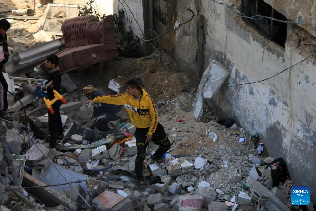 People inspect the damage after an Israeli airstrike in the southern Gaza Strip city of Rafah, on Dec. 19, 2023. (Photo by Yasser Qudih/Xinhua)