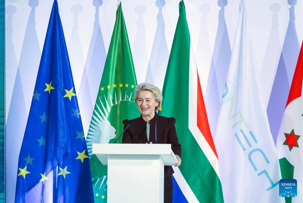Ursula von der Leyen, president of the European Commission, gives a speech at the inauguration ceremony of biotechnology company BioNTech's first manufacturing plant for mRNA vaccines in Africa, in Kigali, Rwanda, Dec. 18, 2023. BioNTech, a leading biotechnology company, on Monday inaugurated its first manufacturing plant for mRNA vaccines in Africa in Rwanda's capital of Kigali. (Rwandan Office of the President/Handout via Xinhua)