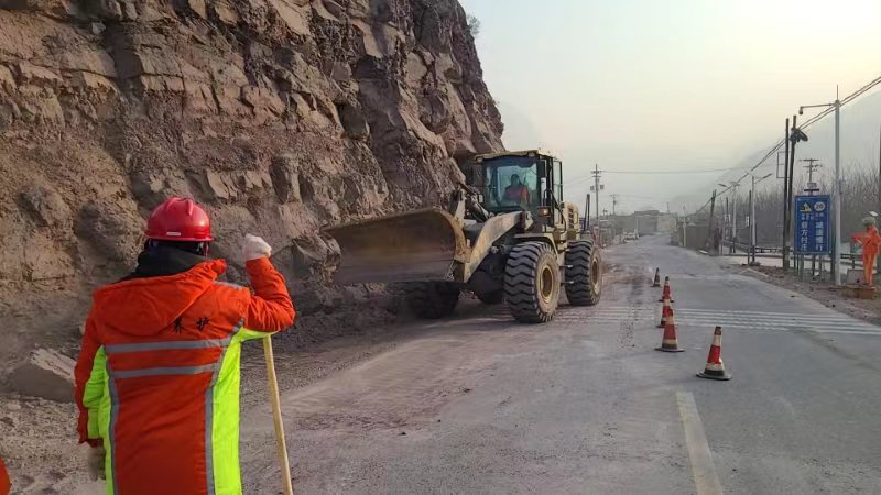 Workers try to restore Xunhua section of Haidong road damaged by earthquake in Haidong, northwest China's Qinghai Province, Dec. 19, 2023. (Haidong Section of Qinghai Highway Administration Bureau/Handout via Xinhua)