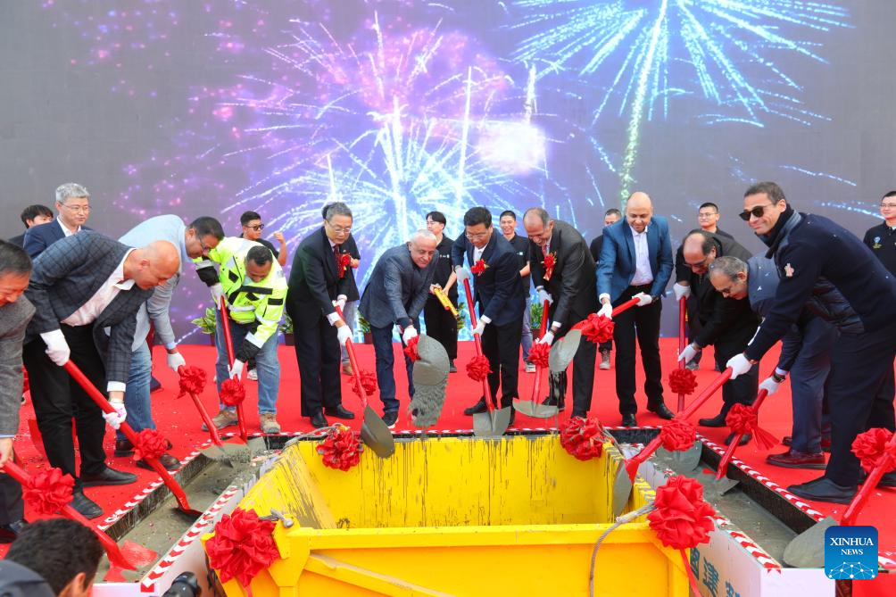 People attend the capping ceremony of the D01 residential building of the Alamein Downtown Towers Project in New Alamein City, Egypt, Dec. 18, 2023. (Xinhua/Sui Xiankai)