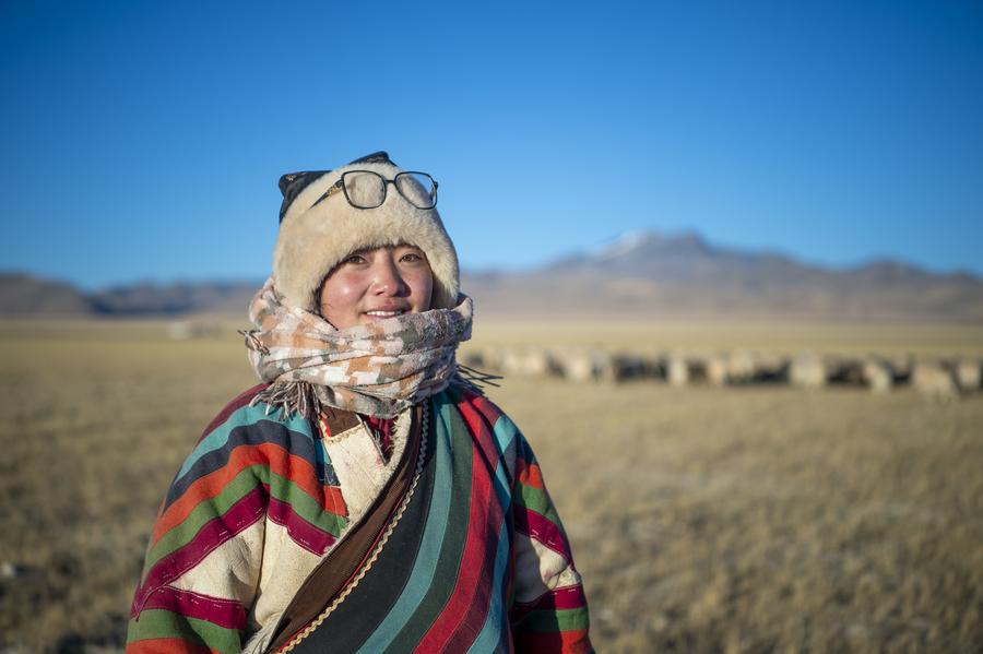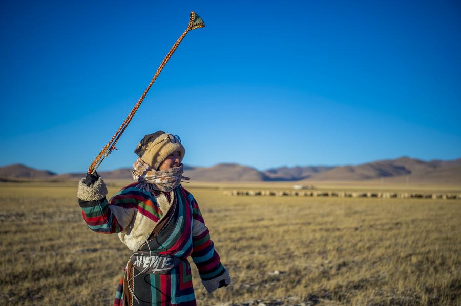 Tenzin grazes sheep on pasture in Ngoqu Town, Nyima County of Nagqu City, southwest China's Xizang Autonomous Region, Dec. 18, 2023. (Photo by Tenzin Norbu/Xinhua)