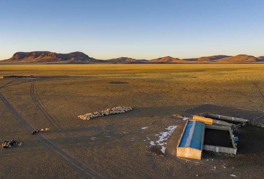 This aerial photo taken on Dec. 18, 2023 shows sheep heading back to shed in Ngoqu Town, Nyima County of Nagqu City, southwest China's Xizang Autonomous Region. (Photo by Tenzin Norbu/Xinhua)