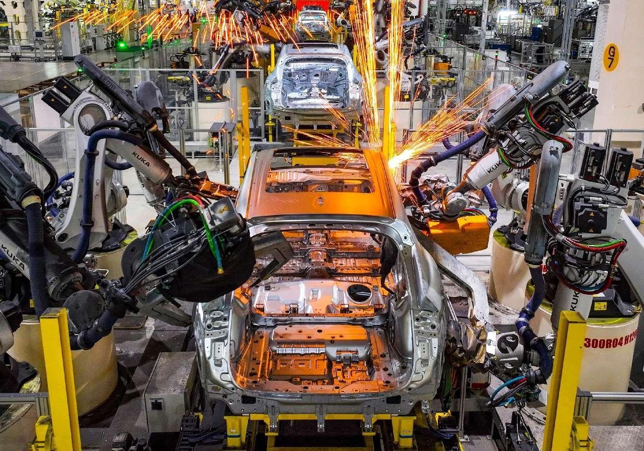 Car bodies are welded by robotic arms at a production base of Lynk & Co, a joint venture between China's Geely and Swedish carmaker Volvo, in Yuyao, east China's Zhejiang province. (People's Daily Online/Hu Xuejun)