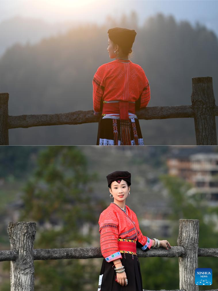 This combo photo taken on Nov. 29, 2023 shows a woman demonstrating folk costumes of Hongyao people in Xiaozhai Village of Longji Town, Longsheng County, south China's Guangxi Zhuang Autonomous Region. (Xinhua/Lu Boan)