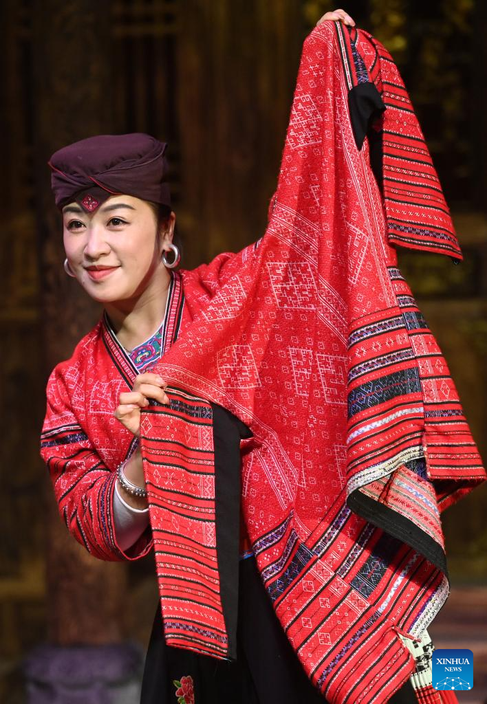 A woman demonstrates folk costumes of Hongyao people during an art show in Huangluo Village of Longji Town, Longsheng County, south China's Guangxi Zhuang Autonomous Region, Nov. 30, 2023. (Xinhua/Lu Boan)