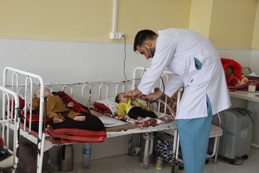 A doctor checks up a malnourished child in Kunduz Province, Afghanistan, Oct. 3, 2023.(Photo by Ahmadi/Xinhua)