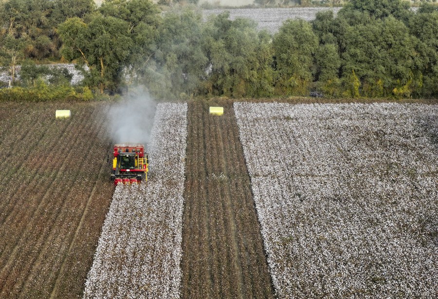 This aerial photo taken on Oct. 20, 2023 shows a harvester working at a cotton field in Weili County, Bayingolin Mongolian Autonomous Prefecture, northwest China's Xinjiang Uygur Autonomous Region. (Xinhua/Wang Fei)