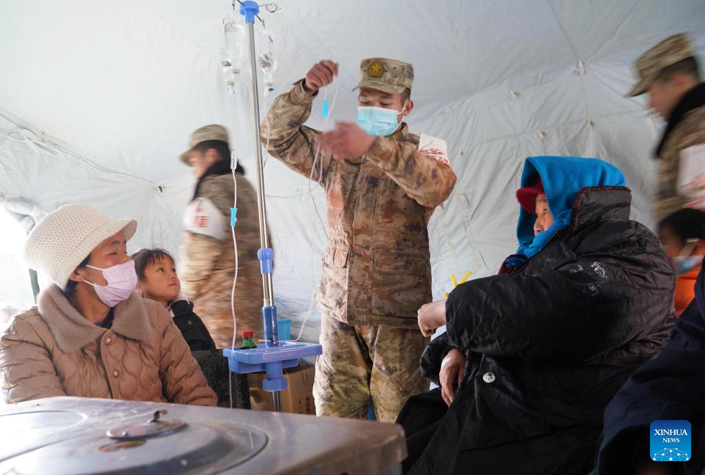 Soldiers provide medical service for quake-affected people in Shiyuan Township, Jishishan County, northwest China's Gansu Province, Dec. 21, 2023. The Chinese People's Liberation Army (PLA) and the People's Armed Police Force (PAPF) have deployed multiple rescue forces to quake-hit areas in response to a 6.2-magnitude earthquake that jolted northwest China's Gansu Province late Monday. (Xinhua/Zhang Yongjin)