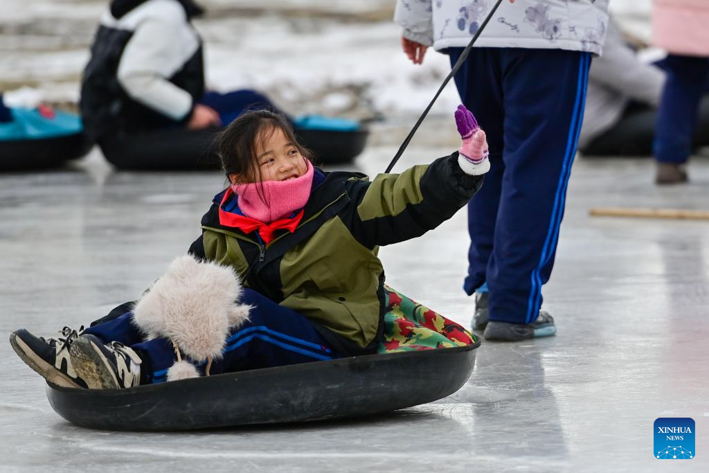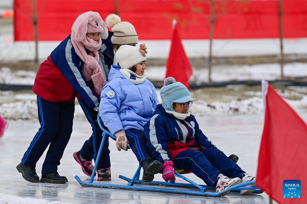 Students experience ice-sleigh at a middle school in Beitun City, northwest China's Xinjiang Uygur Autonomous Region, Dec. 20, 2023. (Xinhua/Ding Lei)
