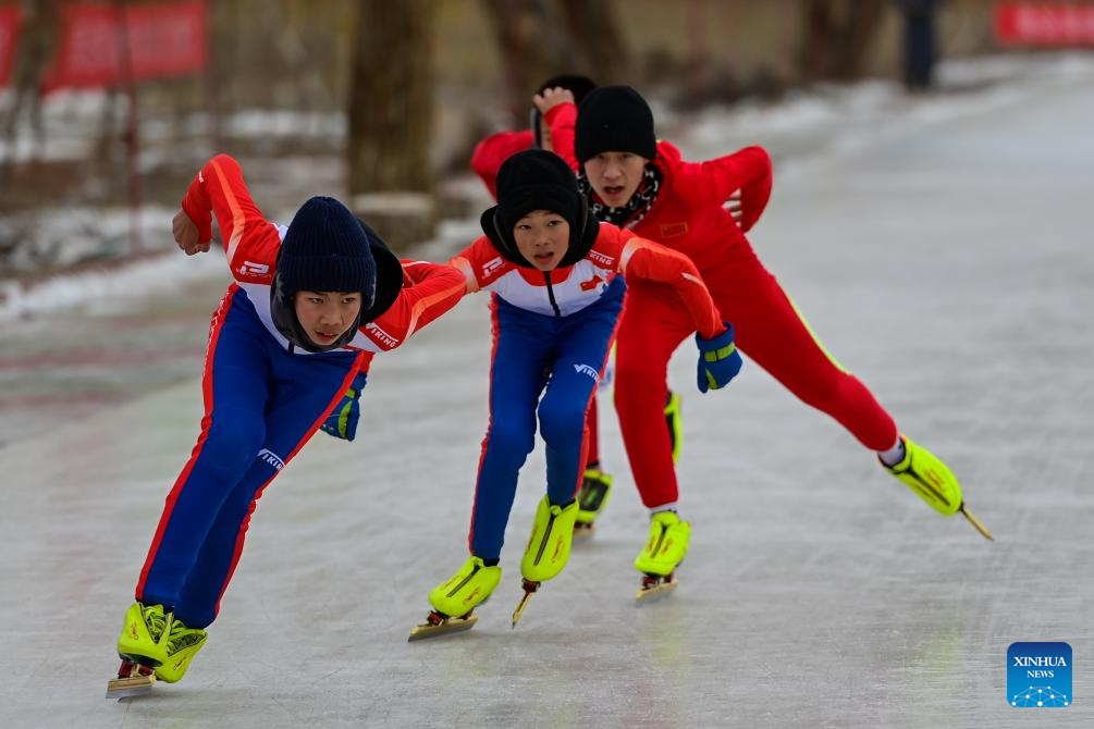 Students practice speed skating at a middle school in Beitun City, northwest China's Xinjiang Uygur Autonomous Region, Dec. 20, 2023. (Xinhua/Ding Lei)