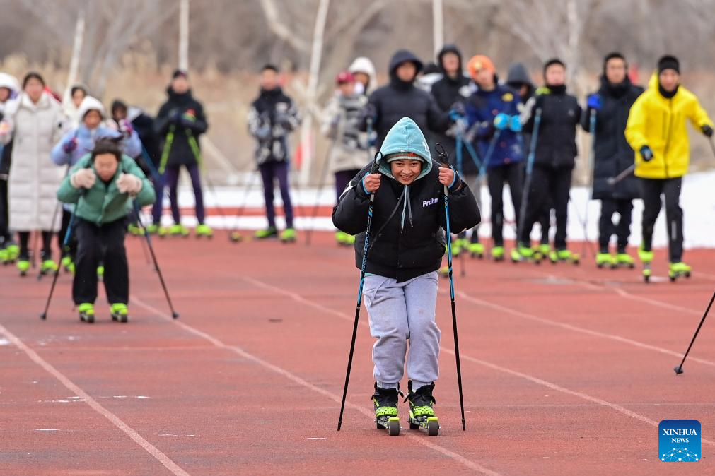 Students practice off-road roller skating at a middle school in Beitun City, northwest China's Xinjiang Uygur Autonomous Region, Dec. 20, 2023. (Xinhua/Ding Lei)