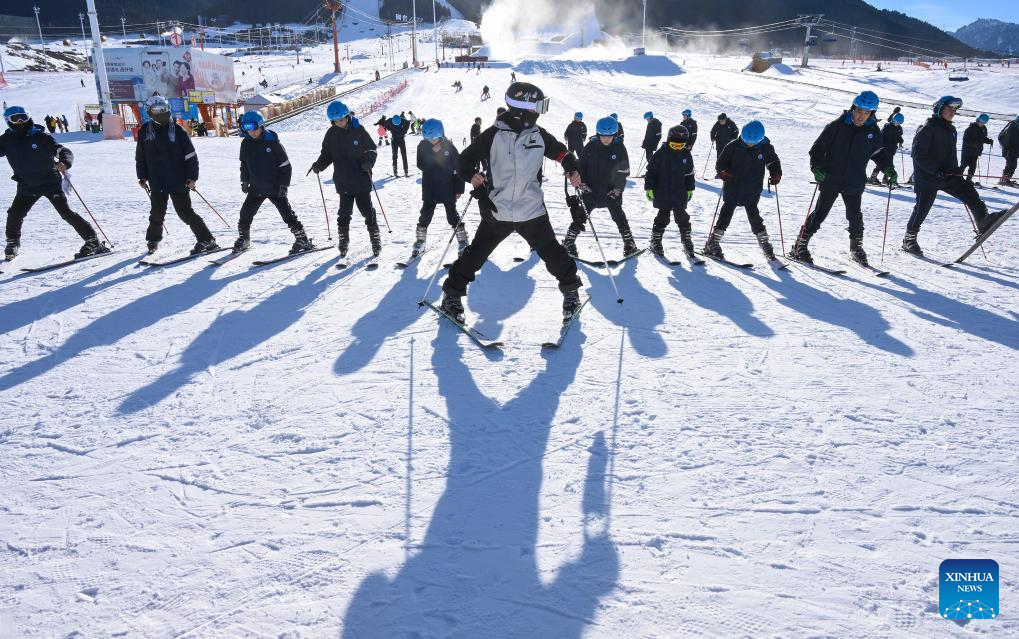 Students of the Miaoergou middle school take a skiing course at a ski resort in Urumqi County, northwest China's Xinjiang Uygur Autonomous Region, Dec. 19, 2023. (Xinhua/Li He)
