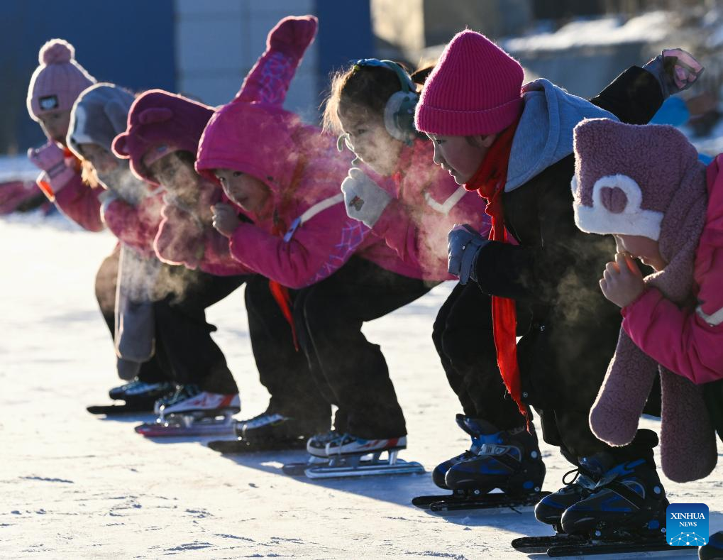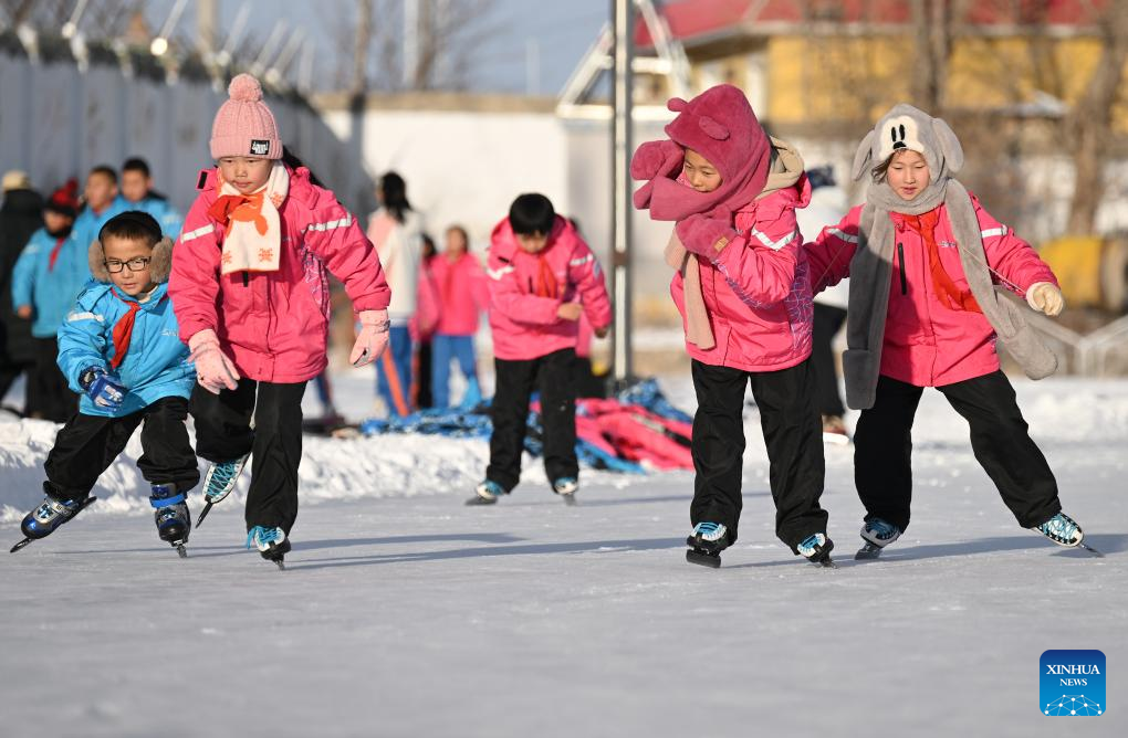 Students take a speed skating course at the Shuixigou middle school in Urumqi County, northwest China's Xinjiang Uygur Autonomous Region, Dec. 20, 2023. (Xinhua/Li He)