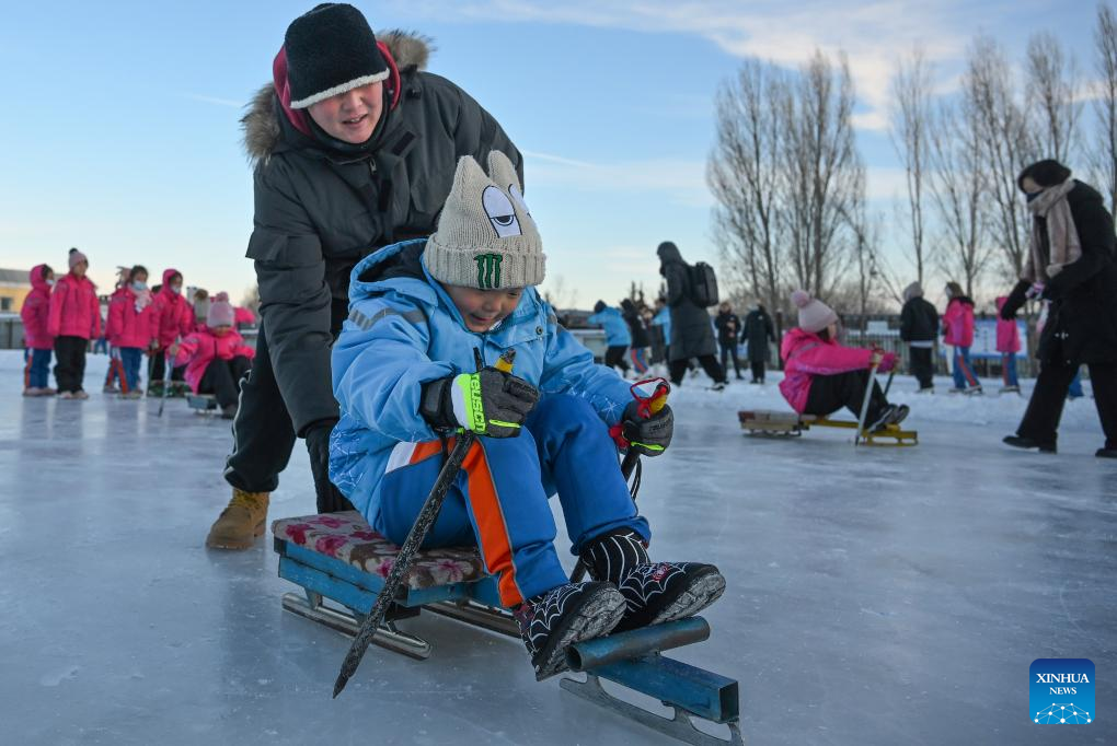 Students experience ice-sleigh at the Shuixigou middle school in Urumqi County, northwest China's Xinjiang Uygur Autonomous Region, Dec. 20, 2023. (Xinhua/Li He)