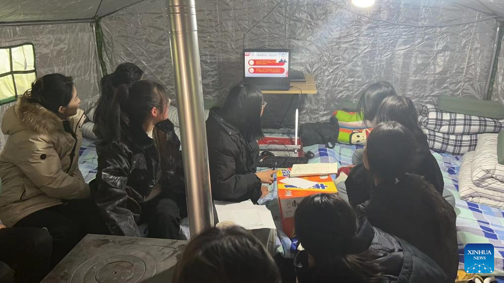 A high school student takes online lectures at a temporary relocation site in Jishishan County, northwest China's Gansu Province, Dec. 22, 2023. Classes have been resumed for high school students via online teaching in Jishishan County after a 6.2-magnitude earthquake late Monday. (Xinhua/Zhang Rui)