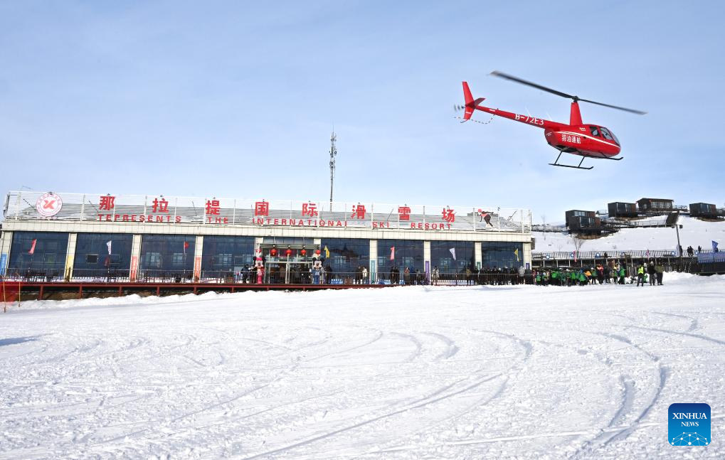 A helicopter for sightseeing flies at Narat international ski resort in Xinyuan County, Ili Kazak Autonomous Prefecture, northwest China's Xinjiang Uygur Autonomous Region, Dec. 21, 2023. (Xinhua/Li He)
