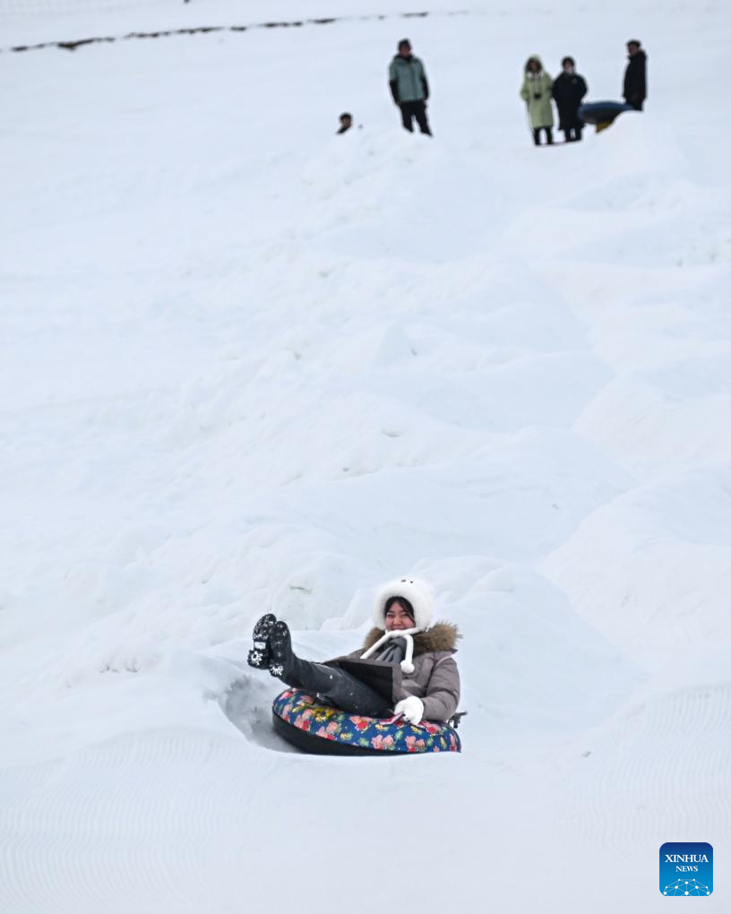 A tourist enjoys snow tubing at Narat international ski resort in Xinyuan County, Ili Kazak Autonomous Prefecture, northwest China's Xinjiang Uygur Autonomous Region, Dec. 21, 2023. (Xinhua/Li He)