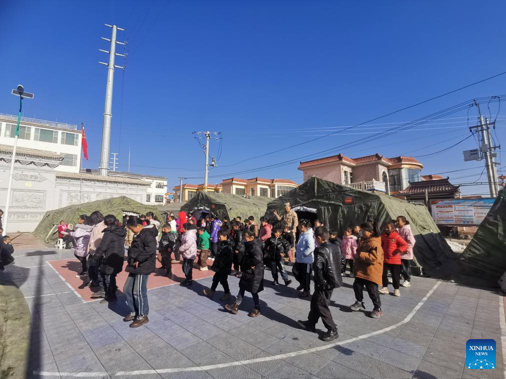 Students take exercise with a soldier at a temporary "tent school" at a relocation site in Xiaohongping Village of Jishishan County, northwest China's Gansu Province, Dec. 22, 2023. The Chinese People's Liberation Army (PLA) and the People's Armed Police Force (PAPF) have deployed multiple rescue forces to quake-hit areas in response to a 6.2-magnitude earthquake that jolted northwest China's Gansu Province late Monday. (Xinhua/Liu Fang)