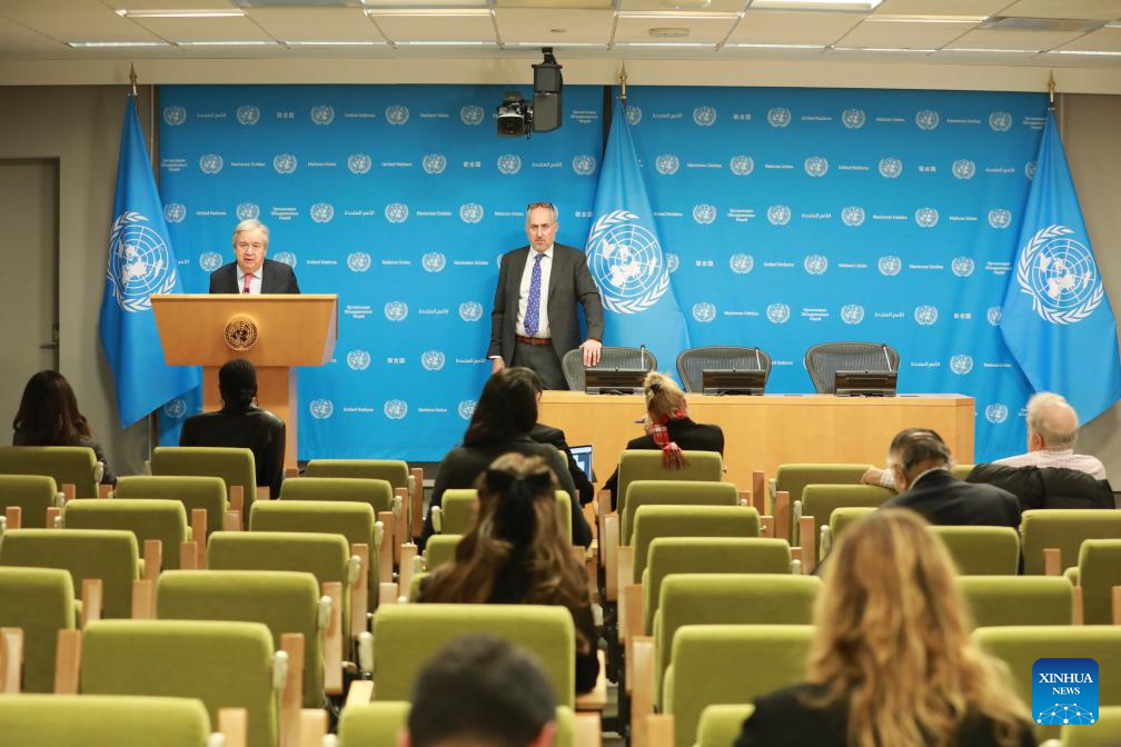 UN Secretary-General Antonio Guterres (L, rear) speaks to reporters at the UN headquarters in New York, on Dec. 22, 2023. Guterres said Friday that the Israeli offensive is creating massive obstacles to the distribution of humanitarian aid inside Gaza. (Xinhua/Xie E)