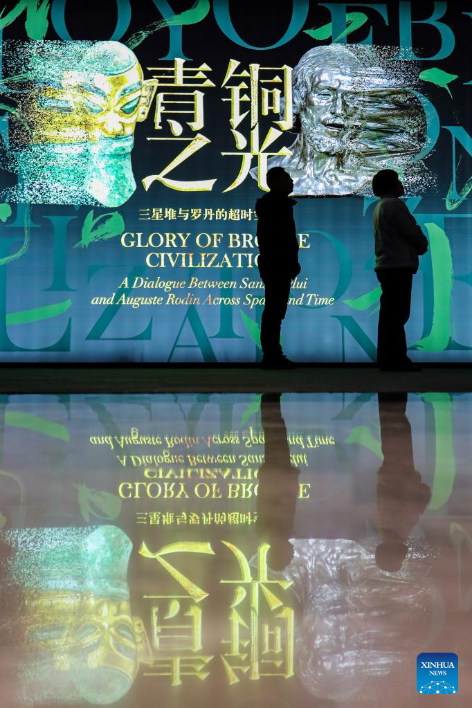People visit an exhibition titled "Glory of Bronze Civilization" in the Museum of Shanghai University in Shanghai, east China, Dec. 22, 2023. The exhibition features sculptures by the French sculptor Auguste Rodin and bronze relics from China's Sanxingdui Ruins. (Xinhua/Xin Mengchen)