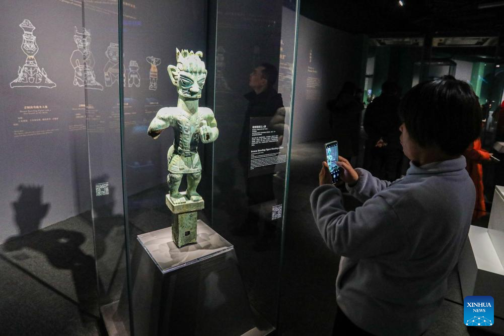 A visitor takes photos of a bronze relic from China's Sanxingdui Ruins during an exhibition titled "Glory of Bronze Civilization" in the Museum of Shanghai University in Shanghai, east China, Dec. 22, 2023. The exhibition features sculptures by the French sculptor Auguste Rodin and bronze relics from China's Sanxingdui Ruins. (Xinhua/Xin Mengchen)