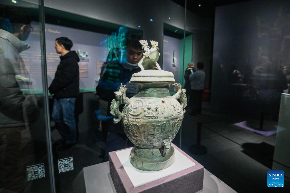 A bronze relic from China's Sanxingdui Ruins is displayed during an exhibition titled "Glory of Bronze Civilization" in the Museum of Shanghai University in Shanghai, east China, Dec. 22, 2023. The exhibition features sculptures by the French sculptor Auguste Rodin and bronze relics from China's Sanxingdui Ruins. (Xinhua/Xin Mengchen)
