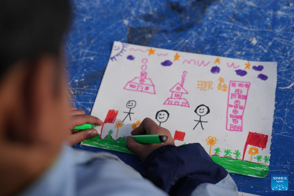 Children works on their drawings at a temporary relocation site in Dahejia Township, Jishishan County, northwest China's Gansu Province, Dec. 22, 2023. After a 6.2-magnitude earthquake hit Gansu Province late Monday, volunteers and psychotherapists started to provide quake-affected children at the temporary relocation site with voluntary classes, including activities such as drawing, games, tutoring, etc. (Xinhua/Chen Bin)
