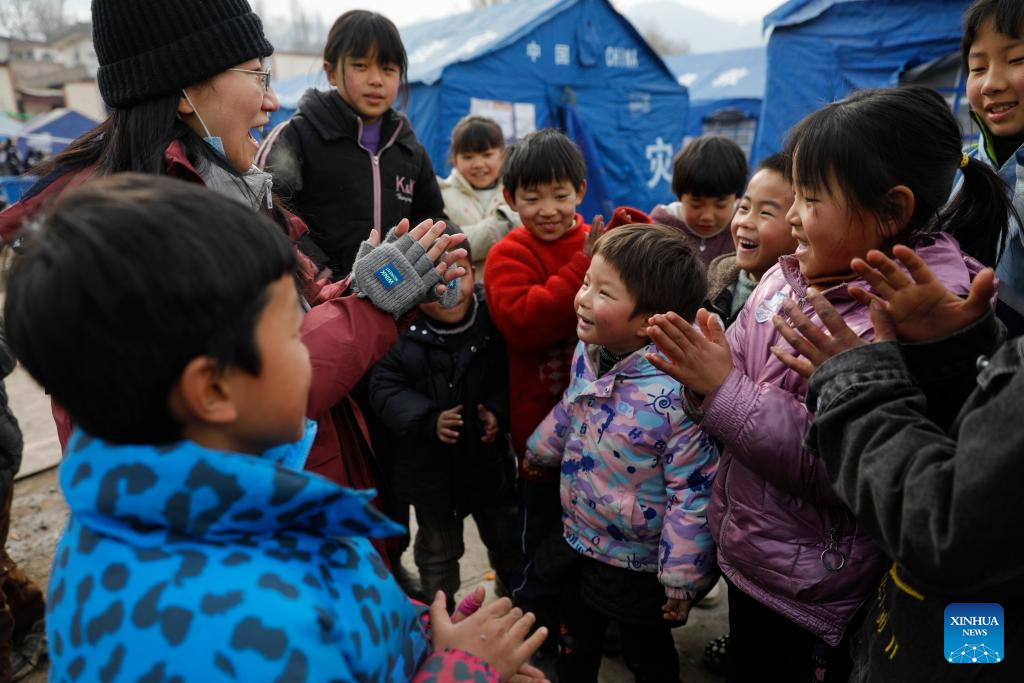 Psychotherapist Hu Jinya (back) plays games with children at a temporary relocation site in Dahejia Township, Jishishan County, northwest China's Gansu Province, Dec. 22, 2023. After a 6.2-magnitude earthquake hit Gansu Province late Monday, volunteers and psychotherapists started to provide quake-affected children at the temporary relocation site with voluntary classes, including activities such as drawing, games, tutoring, etc. (Xinhua/Fang Xin)