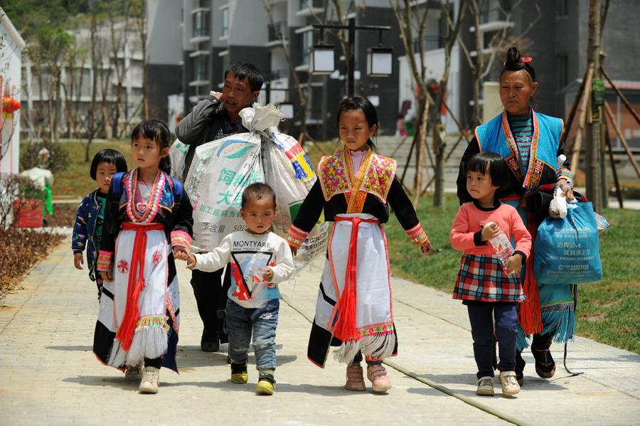 Ji Xue (2nd L) and family members arrive at the relocated community in Xixiu District of Anshun City, southwest China's Guizhou Province, April 22, 2018. (Xinhua/Yang Wenbin)