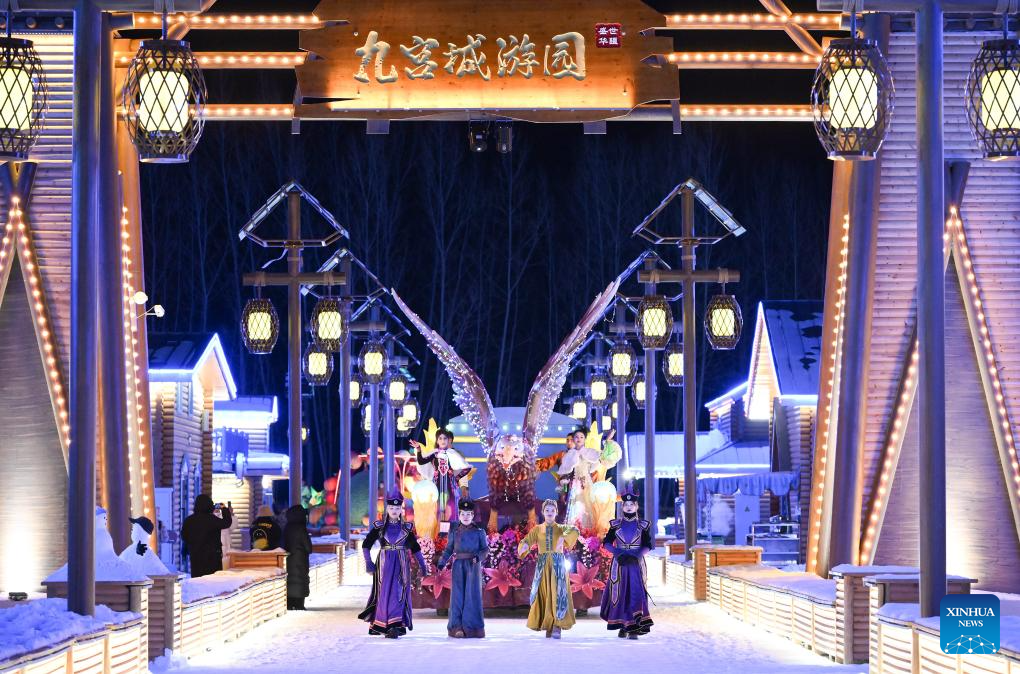 This photo taken on Dec. 22, 2023 shows a float parade at a newly-opened scenic area in Tekes County, northwest China's Xinjiang Uygur Autonomous Region. The scenic area opened recently aiming to diversify the county's winter tourism. During the night hours, various events including dancing performance, float parade and others are arranged here to promote the night economy. (Xinhua/Li He)
